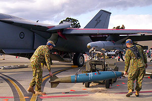 Next, one of the most awesome sights at any airshow, the F-111. The Hornet may have the agility, but our favourite 'swines' have the earth-shaking decibels and the ultimate party-trick in the 'Dump and Burn', an act that will be missed when retirement comes sometime around 2012. To many of us at the eastern end of the crowdline the humour in the sight of A8-271 lighting its torch as it over flew the 'Hogs Breath' café near Clarendon Station was not lost… Royal Australian Navy involvement was limited to a SH-60 Seahawk display and the dancing Squirrel pair from VC 723 - this seemed to be a toned-down performance from those put on at their home base at Nowra. Still, it always makes the hair on the back of your neck stand up when two helos maneuver in close company. An example of each graced the static area.