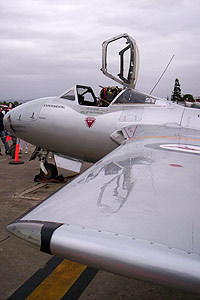 Other highlights included the Temora Museum's Meteor and Canberra, both being ex-UK machines. Don't worry about their being looked after down here, the Meteor has even had zero-houred engines installed during its rebuild. 'Halestorm' was a fine sight and this was the first time for over forty years that a 'Meatbox' had graced Richmond's runway. After arriving in Australia via ship in 2001 VZ467/G-METE was transferred to a hangar at Bankstown airport as newly-registered VH-MBX (for 'Meatbox' of course) and re-assembled. The letters YQ-N were applied to its RAF camouflage before its first flight under southern skies - YQ-N was chosen in recognition of Sqn Ldr Tony Gaze DFC with two Bars, the first Australian to fly operations on Meteors when he joined 616 Squadron RAF in 1945. After being flown to its new home at Temora in western New South Wales the aircraft was rebuilt, complete with zero-houred engines and transported to Albury to be repainted in the markings of A77-851 as a memorial to RAAF Meteor pilots in the Korean War. The real '851, after arriving back in Australia in 1953, was converted to a U21 Meteor drone. The nose section survives today and is on exhibit at the South Australian Aviation Museum. A 76 Squadron Hawk 127 put on a fine aerobatic display and we saw a five-ship show by the PC-9 mounted 'Roulettes'. Being the home of the ALG, C-130s figured heavily in the show - both models in service, the H and the J, showed their handling qualities and were available for a walk-through on the ground. With the imminent introduction of the C-17, 36 Squadron will be passing on its H models to 37 Squadron, which will integrate them with its Js.