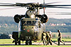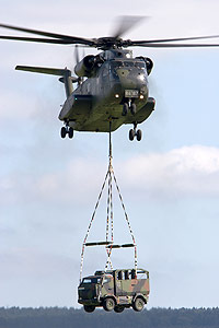 was carried out. Three UH-1D Hueys and Other aircraft also contributed, including a C160D Transall performing a para drop, and a Bo-105 doing high-speed battlefield reconnaissance. It was an impressive sight to see several Hueys and Stallions in action together - these 'old' helicopter types have something that many modern types lack. Is it the 1960s design, or the fact that they're veterans from past wars? Or something else still? Whatever it is, they have 'it', just like the Hind - and unlike the EC135! An unexpected 'finale' of the two-and-a-half hour flying programme was a solo display by a Hungarian Mi-24P. This aircraft, Hind '335', has a remarkable history; it was delivered in 1989 to the East German Air Force, where it flew as '422' with 5 KHG from Basepohl Airbase. After the German reunification, it received the Luftwaffe serial 96+45. When the type was withdrawn from German service, 96+45 was given a special red/yellow/red retirement paint scheme. In 1995, a number of former East German Hinds were sold to Hungary and 96+45 was one of them. Now after more than ten years, this Hind returned for a brief visit to the country where it once started its military service life! Although