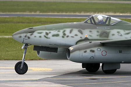 original 1945 production lines! The last Me262 But of course the authenticity can only go so far - safety is all-important, so modern flying systems and engines are used in the 'new' design. The original and primitive Jumo 004 engines would require a complete overhaul after about a dozen hours, and were notoriously unreliable. They have been replaced by modern GE J5s, which are used on many corporate jets and military trainers. Although the General Electric engines are lighter and have twice the thrust, the original engine housing's shape has been retained. Ancillary details are authentic, down to a pull cord that was used by ground crews on the original fighter to start a lawn-mower-size gasoline engine that powered up the main jet engine - of course, it's redundant on D-IMTT. When the access panels are opened, one will see a historically accurate duplicate of a Jumo 004B engine - concealed deep within the casting, the modern power plant will go all but completely unnoticed. Perhaps most significantly, the entire assembly (when mated with the J-85) will closely duplicate the weight of the original Jumo 004, keeping the original performance characteristics of the aircraft.