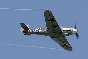 the original aircraft, which had With the absorption of MBB into the EADS group, the machine was donated to Messerschmitt Stiftung, also located at Manching. After many years of inactivity, D-FMBB was restored to flying condition and starred at ILA 2002, where it suffered an engine failure, grounding it until the summer of 2004. One of the pilots to fly the Bf109G, Walter Squirrel, says "Flying a Boeing 747 is like driving a bus - but the Me109 is quality!" It was hoped to fly the gloriously growling Gustav with Rob Davies's P-51D 'Big Beautiful Doll' at ILA 2006, but Rob suffered an unfortunate incident just before landing at Schonefeld when the Mustang lost its canopy, fortunately without injury to the two-man crew or serious damage to the airframe. Maybe 2008 will see all warbirds fit and healthy for what would be a remarkable formation in the skies of Germany.