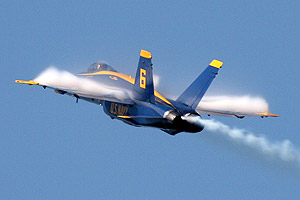 aircraft banking hard, vapour bursting off the aircraft and flares being