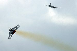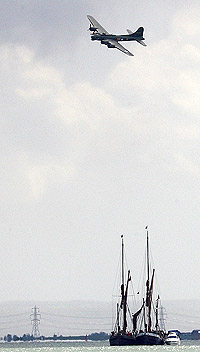 was Only two sets of afterburners at this years show - the first of them was in the shape of the Tornado GR4 entering at low-level over the remains of the pier, plenty of noise thundering as the burners lit up in the dark clouds. The USAAF was next to be represented in the shape of B-17 'Sally B' and a brace of Mustangs - 'Sally B' came in from the right-hand end of the display line with her smoke generator trailing a stream of white smoke from the inboard port engine. You can imagine what goes through the minds of those who can remember them coming back from raids during the Second World War like this.