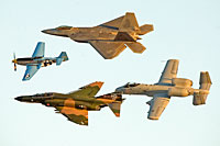 57th ATG, as well as an F-16 from the United Arab The theme of the '21st Century Air Force' was represented with a number of state-of-the-art aircraft parked in the static area, the centre-piece being the Global Hawk from Beale AFB, flanked by the Predator and MQ-9 Reaper. Although the Global Hawk didn't take part in the flying display, the other two types did put in an appearance during the afternoon, flown by the 432nd Wing, located at Creech AFB a few miles north of Nellis. It was recently announced that 39 Squadron had been reformed with the UK's acquisition of the MQ-9 Reaper, with the purchase of the first two aircraft already having been concluded and a third one on the books - they too will fly from Creech. In its USAF form, its primary function is an unmanned hunter-killer weapon, being quite large in UAV terms with a twenty-metre wing span, a range of approximately 3,200 nautical miles and a ceiling of 50,000 feet. Its armament is a mix of AGM-114 Hellfire missiles, GBU 12 Paveway II and GBU-38 Joint Direct Attack Munitions, and at over fifty million dollars falls into the categories of one of the most expensive radio-controlled aircraft ever produced! The schedule of events for the airshow was all-embracing and followed through in chronological order from the First World War through to the Second, then Korea, Vietnam and finally up-to-date with the twenty-first century air force.