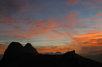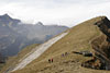only there's no humming or singing Stops are frequent and short. The path gets steeper, but at no point could you say it was mountain climbing - it's just a bugger doing it in the dark. Do they have wolves in Switzerland? Or the abominable snowman? But there's no snow, stupid. Global warming has meant that there hasn't been any snow for the past few years, and none is forecast. The snowline is probably about ten thousand feet, and we're only going to about eight thousand. Mike's a bit disappointed as he wants to get some snow in the background of his pictures, but I'm quietly relieved as we'll be able to sit down and not suffer Ranulph Feinnes-style frostbite of the toes, though I'm sure he'd be a little bit more prepared. The stars fade as the sun rises, and the horizon starts to take shape - heck, we're still in the valley, despite walking for a good ninety minutes. I can just make out the control tower at Ebenfluh, the one we've all seen in the pictures that abound on the 'net. It's not very far, perhaps half a mile, but is also about half a mile higher, it seems. I begin to wish we had some sherpas, mules or anything to carry the load. I'm not worn out, it's just the challenge ahead seems so daunting. We get to