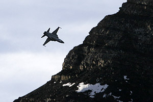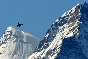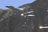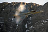 as did the first. A couple of minutes pass, then the F-5s reappear, this time climbing vertically from the north, before again rolling inverted and heading south towards the vast rock face before us. Streaking overhead, they are seemingly facing oblivion against the mountainside, but they pull up hard and head skywards before rolling over the crest and immediately disappearing out of sight toward the Jungfrau in the far distance. It is quite the maddest piece of flying I've ever seen, but I guess it's second nature to the Swiss pilots brought up in this terrain. Perspective makes it seem worse than it probably is, but the sight of an F-5 vertical with a rock face as the backdrop is quite breathtaking - pity it's too far for the 300mm to give it justice. In fact, the action is so frenetic I give up on trying to take pictures and just watch the insanity of it all. A third pass beckons - this time it's from the south, and the target is away to our left against a rock face just beyond the helicopter landing pad next to the tower. Diving down, the F-5s roll over the target and dive into the valley below, as they know there is nothing to hit within the carpet of cloud. The guns are firing now, the tell-tale smoke appearing long before the 'braaaaap' assaults the eardrums. Some photographers claim to catch the shells leaving the cannons - all I can say is I'm lucky to catch the F-5s. Few shots are sharp, but I hope I'll do better later on…