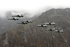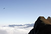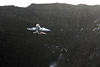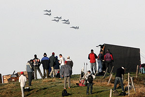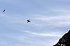 - to the north a carpet of cloud is bathed in warm sunlight, At eight-thirty the scanners around crackle into life - the first jets have taken off from Meiringen and will be here in a matter of minutes. We scan the cloud layer to the north and spot specks popping out into the azure blue sky, probably about five miles or so away. Eight F-5Es are airborne, the first wave of the morning's action. Anticipation now builds - where will they come from, what height and how far away will they be, what exposure will I need? We've been told that a 400mm lens is needed, but that was in the prehistoric days of film - with digital it shouldn't be so bad. I go with the 300mm f4, and stick the camera into Tv mode, something I don't normally do, but I'm guessing that against the rocky background the camera should be able to sort out the exposure. Being an Axalp virgin, I err on the side of caution and set the shutter speed at 1/500. "Chicken", I think to myself, but don't want to have come all this way and screw the shots with camera shake. All eyes