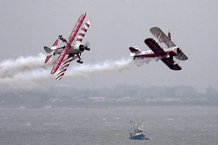 Plane Sailing's Consolidated PBY-5A Catalina was the next aircraft to show itself over the sea - the amphibian aircraft is always slow and majestic in its display. Fittingly, as this aircraft was used by the RAF Coastal command during the Second World War, it flew over the Royal Navy Destroyer HMS Exeter (D89), which was making its way up the Thames to take part in a media event later in the week. Low cloud or not, it didn't put off the next act in the show, the girls and Stearmans of the Team Guinot Wingwalkers. The damp and miserable weather did not put off the girls from putting on their best display to all. The Fleet Air Arm's 'Blacks Cats' were the next flying display, or should that be 'Black Cat', as only one of the Lynx helicopters from the Royal Navy display team flew in from the left. A short display was put on by the solo pilot in front of Maxim's Casino (the main sponsor of the airshow), which left most of the audience viewing the display from a distance only really seeing the aircraft on its entrance and exit.
