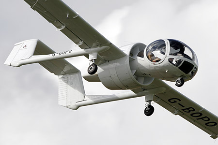 Gary Parsons reports on Sywell's 2008 Airshow, held on 24 August, which saw the return of an eighties' aviation dream. Pictures by the author John Edgley, the engineer who established the Optica project, the radical design concept for a slow-flying observation aircraft that was so far ahead of its time when launched in the early 1980s, has recently repurchased the design rights plus the jigs and tools needed for production, together with three aircraft, the first of which 021 (G-BOPO) is now flying and was the star of the show at Sywell. The Optica has an unusual configuration with a fully-glazed forward cabin seating three across, reminiscent of an Alouette helicopter. Behind it is situated a Lycoming flat-six engine powering a ducted fan, twin boom cantilever tailplane with twin rudders and a high-mounted single elevator. The wings are unswept and untapered, and the aircraft is of a fairly standard all-metal construction with stressed aluminium skin. Its distinctive appearance led to it being known as the 'bug-eye'.