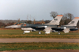 F-5E on 22 June of that year. The The first two of an intended complement of eighteen F-16Cs arrived at Bentwaters on 14 June 1988. These were single examples taken from the 52nd TFW at Spangdahlem AB and the 86th TFW at Ramstein AB. The squadron was officially activated on 1 July 1988, with the first four months dedicated to pilot conversion for the new aircraft. The 527th AS resumed their aggressor role in November 1988 when six McDonnell Douglas F-15C Eagles from the 36th TFW at Bitburg AB, Germany arrived at Bentwaters for the start of a three-week DACT course. The 527th's complement of aircraft had reached twelve on 16 January 1989 when one more F-16C was delivered from Spangdahlem. The 527th AS made their first deployment to Decimomannu with the new type on 30 March 1989 when six aircraft deployed to the ACMI range for two weeks. The 527th