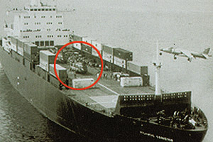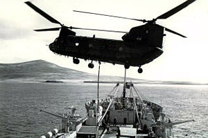 In April ZA718 was cocooned in plastic and loaded aboard the container ship MV Atlantic Conveyor along with three other Chinooks and six Wessex helicopters of 848 Naval Air Squadron, D Flight, to commence the long journey to the South Atlantic. Detachment commander Squadron Leader Dick Langworthy and a hundred of his 18 Squadron colleagues were embarked on the commando ship HMS Fearless that sailed into San Carlos Water with the main invasion force on 21 May. They were subject to daily bombing raids by Argentine jets; "I did not like running commentaries of bombing raids by the Navy" said Wing Commander Lawless, then a Flight Lieutenant serving with 18 Squadron. "On a ship you are not the master of your own destiny. You were powerless."