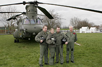During a three-day period, the aircraft averaged nineteen flight-hours per day, delivering combat vehicles, artillery and troops. The mission was the first opposed UK helicopter assault since the Suez Crisis in 1956 and the largest in UK military helicopter history. Over the next three weeks, 18 Squadron flew support missions for British troops operating around Basra, before returning home early in the summer. The squadron's contribution to the success of the Al Faw operation was recognised with Carr being awarded the DFC for his role in the operation. On the night of 11 June 2006 Flight Lieutenant Craig Wilson, Captain of ZA718/BN from 1310 Flt in Helmand Province, was tasked to recover a casualty from a landing site in Afghanistan. In difficult and dangerous conditions, despite having done little night flying in Afghanistan, he flew at 150 ft and made a precision approach and landing to extract the casualty. A few hours later he was tasked with a further casevac, but had to hold off while an Apache gunship suppressed enemy action - despite being low on fuel he made another difficult landing before returning to base with just enough fuel to remain airborne. Then despite having been on duty for over twenty-two hours he volunteered to deliver reinforcements to help a threatening ground situation. His gallantry and extreme and persistent courage ensured the recovery of two badly wounded soldiers and played a vital role in saving their lives. Flight Lieutenant Wilson received the Distinguished Flying Cross for 'exceptional courage and outstanding airmanship' while operating in Helmand Province. He said it was a team effort, adding "I suppose really it's sort of bitter sweet, as it's very nice to receive an award, but it's for everybody. You can't do it on your own, but it just happened to be my name that was put forward. It takes four people to fly a Chinook." On 9 December 2004, Sir Michael Jenkins, president of Boeing UK, presented to the Royal Air Force Museum at Hendon a painting depicting the two DFCs completed by 'Bravo November' at that time. Copies of the painting were signed by the late Sqn Ldr Langworthy's widow, Jean, and his senior officer, retired Air Vice Marshal Tony Stables, as well as Sqn Ldr Carr and Boeing artist Joe Naujokas.