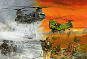 By sheer chance, 'Bravo November' was airborne on an engineering test flight at the time of the attack - the other helicopters aboard were all lost, along with the second-line repair and maintenance support equipment and stores. The crew of 'Bravo November', captained by the late Sqn Ldr Dick Langworthy, managed to make it to safety on the aircraft carrier HMS Hermes, ZA718 being nicknamed 'The Survivor'. Operating without spares, tools or lubricants, 'Bravo November' flew for several weeks before additional Chinooks arrived on the battlefield. On 26 May a much-reduced 18 Squadron contingent prepared to operate 'Bravo November', but without tents, radios or any of the specialist equipment needed to keep a Chinook flying they ended up working alongside Navy helicopter units. On strength were one Chinook helicopter, two four-man crews, nine technicians and ten men - all the spares, tools and servicing manuals had been lost aboard the MV Atlantic Conveyor. ZA718 was by far the largest helicopter available to the British forces in the Falklands, capable of carrying about twelve tons.