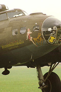 Production at Binbrook lasted some three weeks, throughout which the sun shone and the evenings were long and warm. many people ventured to the old spotting haunts of the Lightning days to try and catch a glimpse of the action, but security was tight and some minor roads were cordoned off, quite understandable as a Ford Sierra in the background with some anorak sporting binoculars would have dented any authenticity somewhat. Views were afforded from afar, the sight and sound of B-17s landing over the hedge with one prop feathered and smoke billowing from the dead engine is one that will remain in the memory for many years; it was as if you had been transported back in time. All five Fortresses sported many different identities during the three weeks, often carrying differing schemes on each side of the aircraft. All were fictional, but well in keeping with the spirit and style of the times, with names such as 'Windy City', 'Cloony Baby' and 'My Zita'. With all the changes it was impossible to know which aircraft was which, but generally 'Sally B' stood in for the 'Memphis Belle' for much of the time.